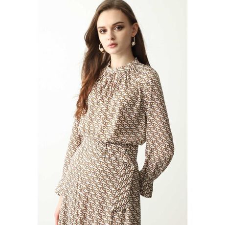 スタンドカラーが上品な雰囲気を与えつつ、タックドレープとスリット開きが華やかな印象のブラウス。クラシカルなベルトモチーフ柄がトレンド感も演出してくれる今季マストなアイテムです。