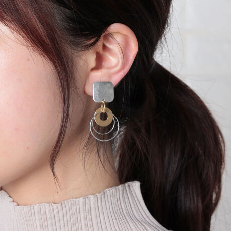 シルバー×ゴールドのコントラストの効いたカラーが印象的なイヤリングです。角に丸みを持たせたスクエアパーツと3つのリングを組み合わせました。控えめな輝きは、上品な雰囲気を漂わせます。程よく存在感のあるサイズも魅力。大人なコーディネートにぴったりの、モダンなアイテムです。