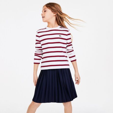 おてんばな女の子たちのヘビーローテーションにも耐える、肉厚なコットンジャージ素材を使用。全身にオーセンティックなボーダーパターンをあしらった、タイムレスなマリンボーダーカットソーです。左胸にトレードマークのワニロゴパッチ、首後ろにもネーム入り。