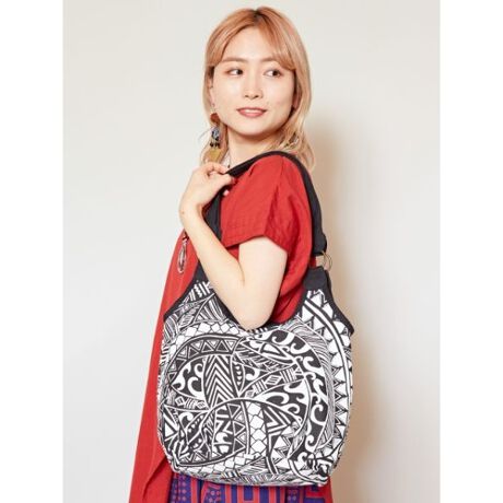ポリネシアントライバル柄のキャンバス素材バッグ。持ち手が長めなので肩に掛けやすく、デイリーに使いやすいデザイン。内ポケット付きで小物を整理しやすいのも嬉しいポイントです。コーデのアクセントにも活躍します。