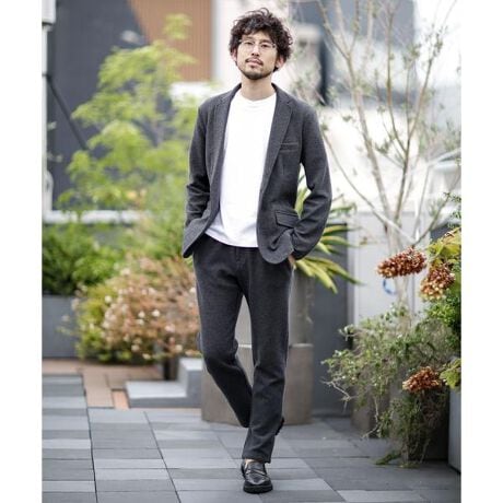 「スーツよりもカジュアルなジャケパンスタイル」としてナノ・ユニバースで人気のイル・ビリキーノシリーズのセットアップスーツ。リング糸をジャージ素材で編立てたカジュアル顔で、縦横ストレッチの優れた素材の為快適な着心地に。