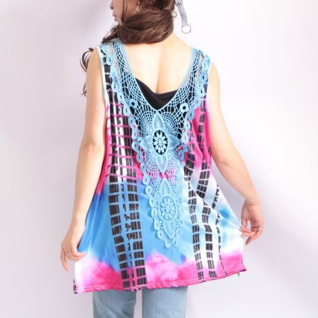 ビビットなカラーレースと個性的なタイダイプリントを合わせた大人可愛いタンクトップ♪