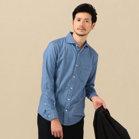 セミワイドカラーはドレスシャツで見かける襟型ですが、全体的にややリラックス感のあるサイズにしており、程好いカジュアル感を演出しています。
