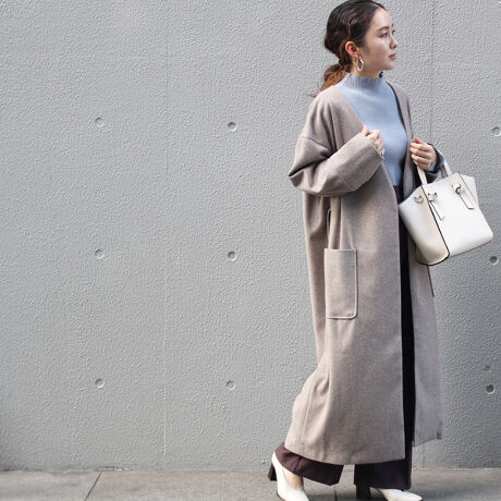 スウェットやロンTとカジュアルに合わせてさらっと羽織っていただくのもおすすめです。ノーカラーなので、タートルやマフラーなど首回りにボリュームあるデザインのアイテムを持ってきて大人フェミニンなコーデも楽しめます。