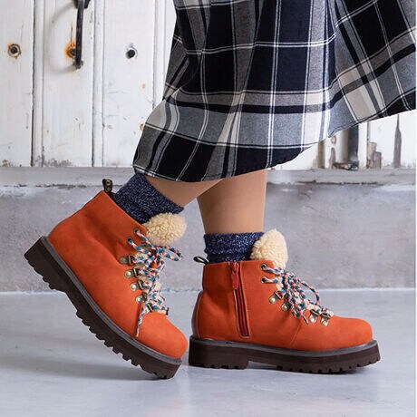 リンクローバーのトレッキング風レースアップシューズシンプルなトレッキング風シューズに異素材のベロでアクセントをつけてかわいく仕上げました。内側サイドがファスナー仕様で脱ぎ履きが楽にできます。メンズライクなスタイルはもちろん、スカートとの相性も◎。その日の気分でいろいろなコーデが楽しめるおすすめの1足です。
