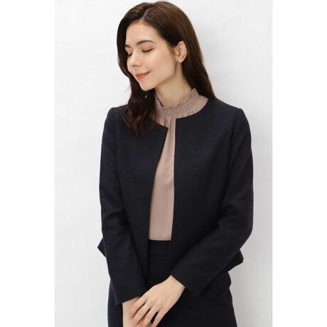 さりげないラメの入った、NBBの定番素材スラブボーダーツイードを使用したセットアップシリーズ。光沢のあるスラブ糸とリング糸、ラメ糸をボーダー状に織り上げ、表情のある柔らかな着心地の素材に仕上げました。コンパクトなシルエットのノーカラージャケットは、毎日の通勤服としてはもちろん、同シリーズのスカート、ワンピースとのセットアップならフォーマルシーンにも活躍してくれます。裏地付き。■シリーズスカート[品番:0170229414]、ワンピース[品番:0170249414]