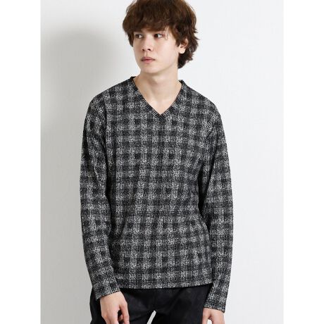 セマンティックデザイン ストレッチ かすれチェックジャガード Vネック長袖Tシャツ