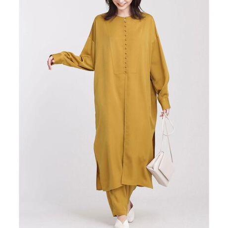 マットな光沢サテン生地が今年らしく上品なセットアイテム。胸元のブザム切り替えが特徴の前後2wayワンピース&キレイめパンツのセットで、ON/OFF問わずに活躍する着回し力抜群のアイテムです。