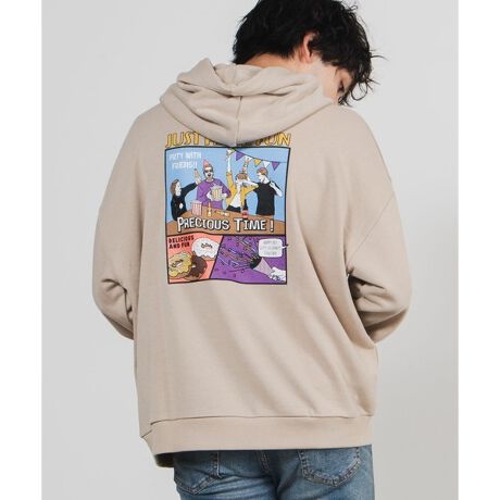 背面に施されたレトロなグラフィックプリントが魅力のプルパーカー。
