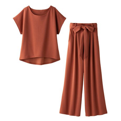 ウエストリボンがフェミニンなワイドパンツのセットアップ。