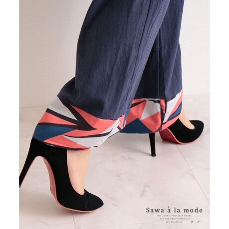 サワアラモードのエスニック風裾プリントのワイドパンツ ネイビー ロング丈 レディース