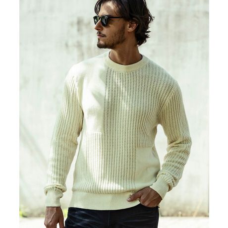 丁寧に編み込んだワッフルと天竺の切り替えによるブロッキングデザインが、アイテムに立体感を生み出し、大人の遊び心をくすぐる逸品に仕上がりました。