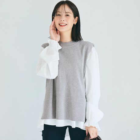 ニットベストとブラウスの2点セットで、一枚で大人っぽいレイヤードスタイルが完成。