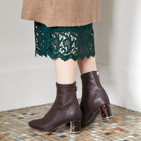 ヒールにプラスした金具調ラインが洗練アクセントに。バックジップで着脱もスムーズ◎