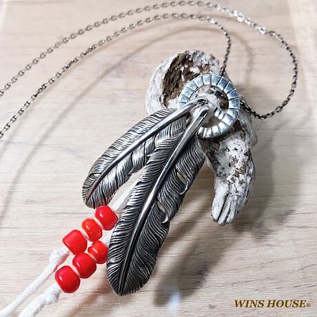 大小2種類のフェザーをホイールに編み込んだペンダントトップ。フェザー1枚1枚を細部にまでこだわりながら丁寧に仕上げ、裏側にはブランドマークを装飾。ホイールに編み込んだ革紐には耐久性の高い鹿革を使用し、こちらもしかりと固定。歩くたびに揺れるフェザーが大空を羽ばたくイーグルを連想させ、コーディネートの主役になってくれます。