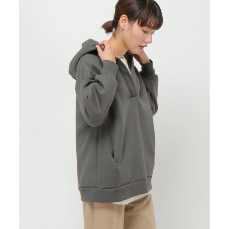 [型番:26930151]チュニック丈でゆったりとしたシルエットで着られるプルオーバー。フード付きでカジュアルに仕上げました。深めのスキッパー仕様のネックは、レイヤードスタイルを楽しめます。