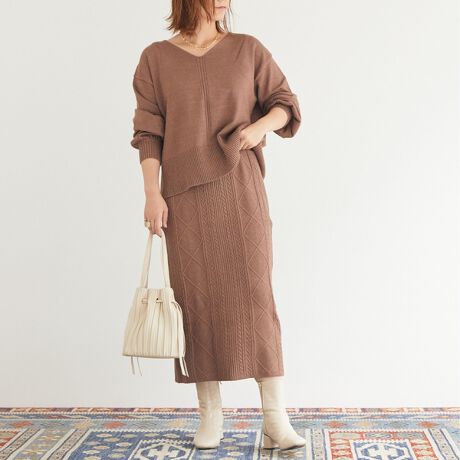 女性らしいスタイリングが完成するニットのセットアップ。単体でも着まわせるデザイン性にも注目です。
