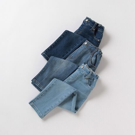 デニム素材でちょっぴりこなれた雰囲気をただよわせたスキニーパンツです。ストレッチ入りのスッキリとしたシルエットで、シャープなイメージも加速しました。ウエストにはサイズ調節ができるアジャスターゴムをセット♪ 色落ち加工でさりげなくヴィンテージ感も取り込んだ、大人顔負けのアイテムです。内側にはお名前を記入できるタグつき。※コーディネート画像はイメージです