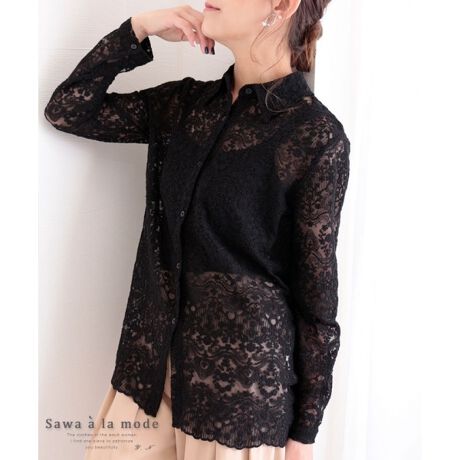 サワアラモードのエレガントな総レースシャツブラウス ブラック 長袖 レディース