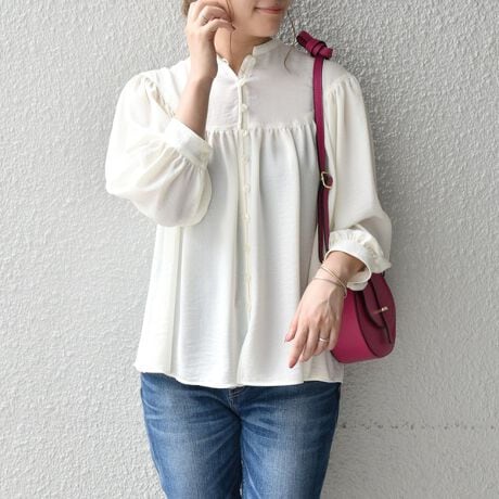 贅沢なギャザーがフェミニンな印象で、カジュアルだけではなくきれいめなスタイルにもマッチするデザインです。