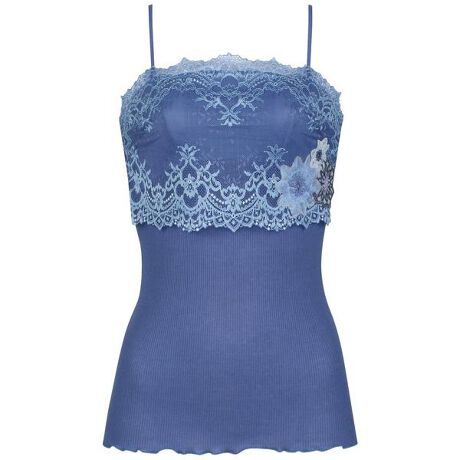 ・トレンド感あるリブニット素材を使用・胸もとにあしらった3色切り替えの高級感あるラッセルレースがポイントの、アウターとの着合わせのよいキャミソール・ラメ糸の輝く幾何学模様のアップリケ付き