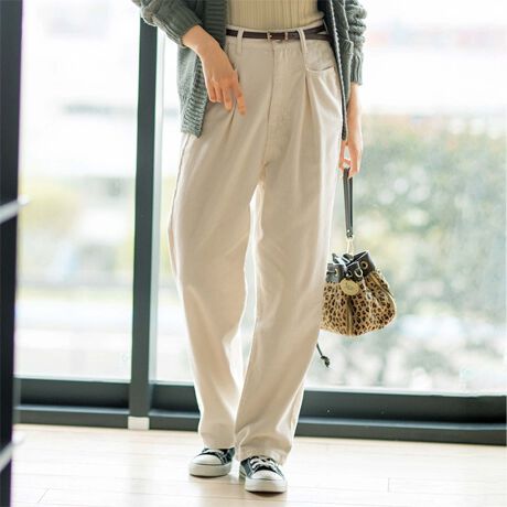 ゆるっとカービーなシルエットながらフロントのタックによって美脚見えが叶う。温かみのあるコーデュロイ素材が、大人の洗練カジュアルにぴったり!