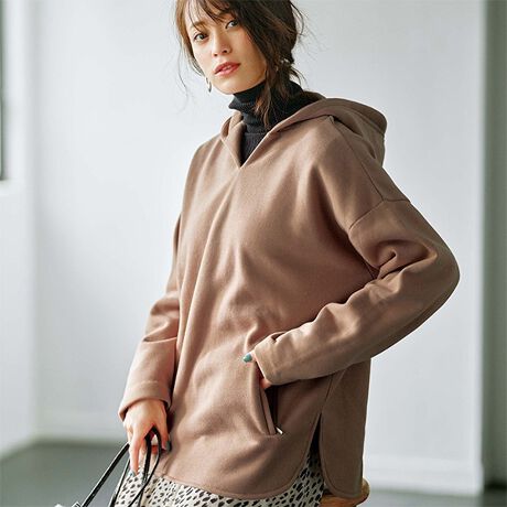 後ろの丈が長めなので、スカートにもパンツにもバランスが取りやすくコーデしやすい。裏起毛で暖かな着心地も嬉しい。冬の大人カジュアルに欠かせないアイテム。