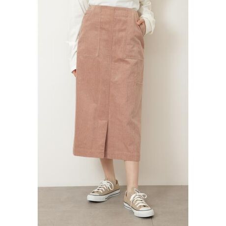マットな太コーデュロイ素材を使用したナロースカート。パッチポケットをアクセントに、カジュアルさをプラスしたデザインです。センターのスリットで抜け感のある女らしさと足さばきの良さを兼ね備えました。ウエストの後ろにゴムを仕込み、トップスインしてもすっきりしたラインを演出します。