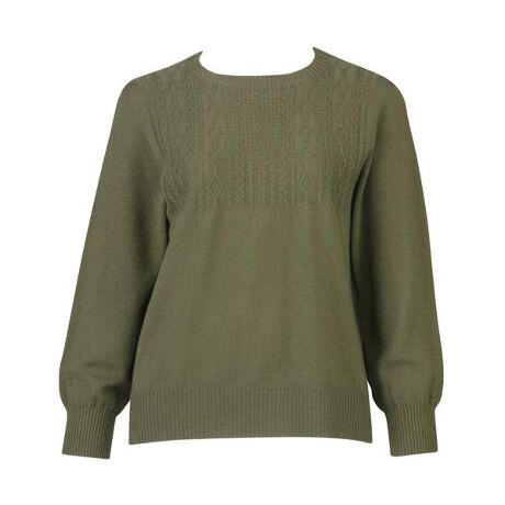 ・年齢による体型変化に対応した独自のパターン設計(おなかまわりゆったり)・前後差のある脇スリットは腰まわりをカバーしながらも軽やかな印象・ホールガーメント(R)製法なので縫い目がなく、やさしい着ごこち(NUONE〈ヌワン〉とのコラボ商品)前後差のある丈だから、前をINした着こなしも楽しめる。胸もとにあしらったアラン模様がポイントのデザイン