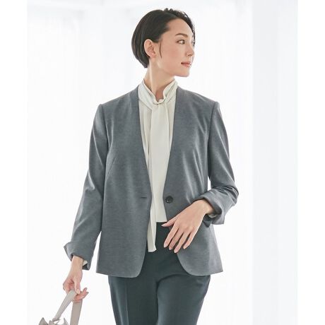 従来のノーカラージャケットよりもスタイリッシュでシャープな印象にアップデートしました。パンツやドレススタイルを、いつもよりも大人っぽくコーディネートできる1枚です。