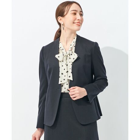 従来のノーカラージャケットよりもスタイリッシュでシャープな印象にアップデートしました。パンツやドレススタイルを、いつもよりも大人っぽくコーディネートできる1枚です。