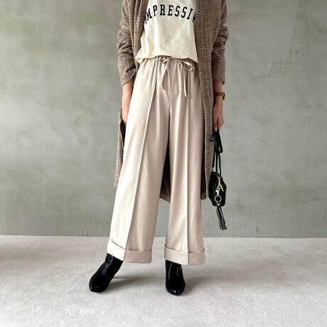 とろみのある素材で落ち感を出したパンツは美脚効果抜群。
