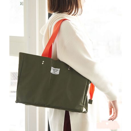 マチを持たせたスクエア型エコバッグで、長めのハンドルは、アウターの上からも肩掛けしやすくなっています。