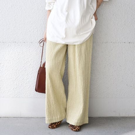 ワイド型なので足のラインを拾わず楽に履けるパンツです。ウエストはゴムなのでストレスフリーなのも◎。