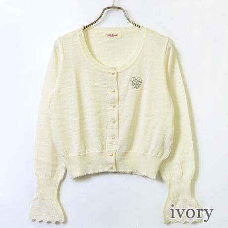 袖口に繊細な透かし編みが施された胸元のロゴ刺繍がポイントのカーディガンウール100%でワンピースにも合わせやすい丈感[型番:1062122]