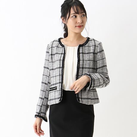 カールパークレーンの格子ツィードブレード付ノーカラージャケット★華やかな存在の大きめのチェック柄ツイードジャケット★ひと目で華やかな存在の大きめのチェック柄ツイードノーカラージャケット。華やかなツイードは、クラシカルなコーディネートtには必須アイテム。きれいな色使いで、レディがときめく配色でフレッシュに。[型番:117022]
