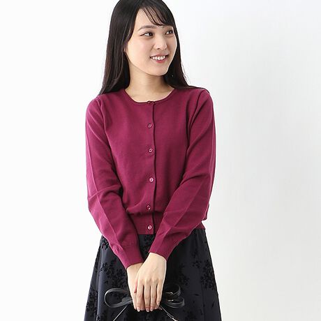 ★ころんとしたボタンがフェミニンなカーディガン★シンプルでベーシックなデザインに、コロンとした透明感のあるボタンが印象的なカーディガン。ワインカラーは、1点投入で女性らしさを格上げしてくれるオススメカラーです。グリーンは、大人レディな秋冬にはマストなお色味。ウールが入ってないので、3シーズン羽織れるカーディガンです。