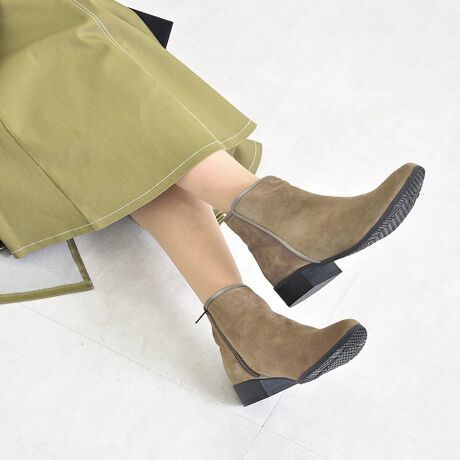 山羊スエードと山羊スムースを使ったパイキングデザインの本革ショートブーツです。