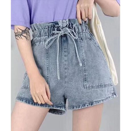 レディースふんわりリボンのフリル風ハイウエストデニムショートパンツ