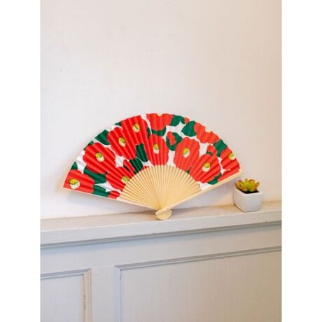 扇子いっぱいにあしらったモダンで華やかな椿の花柄。椿の花言葉は 「控えめな優しさ」「誇り」。