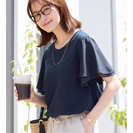 【suzu salalaシリーズ】袖に”ヒラリ”と2枚重ねたシフォンが、定番Tシャツをお洒落にチェンジ。