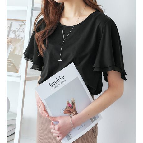 【suzu salalaシリーズ】袖に”ヒラリ”と2枚重ねたシフォンが、定番Tシャツをお洒落にチェンジ。