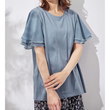 【suzu salalaシリーズ】袖に”ヒラリ”と2枚重ねたシフォンが、定番Tシャツをお洒落にチェンジ。