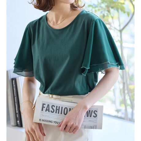 【suzu salalaシリーズ】袖に”ヒラリ”と2枚重ねたシフォンが、定番Tシャツをお洒落にチェンジ。