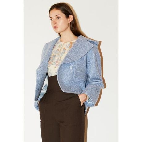 冬のコート前の羽織にぴったりな、起毛感のあるカットソー素材を使用したブークレショートジャケット。柔らかさがあり、女性らしい印象を与えてくれる素材感です。フラップの付いた大きめポケットディテール、襟続きのフードがカジュアルなアクセントに。大きいカラーを少し後ろに抜いたように着用するのも◎。スカートやワンピーススタイルのライトなアウターとしてお勧めです。