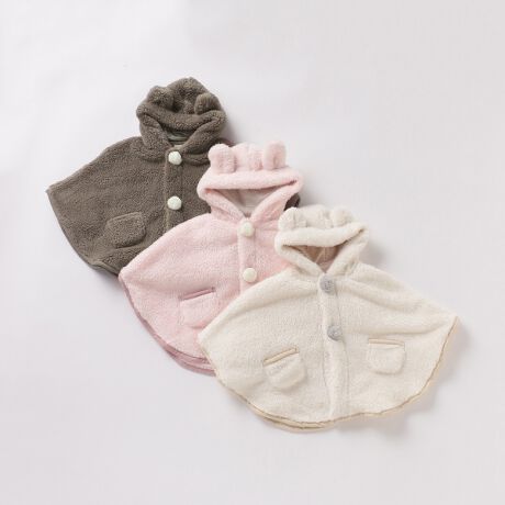 まるで本物のアニマルのようなもこもこ具合がかわいらしいボアケープです。お耳つきフードをかぶれば、より一層キュートさがアップ♪ 羽織るだけで防寒対策ができる手軽さも魅力です。裾はスナップボタンで留められるので腕を通すことも可能。いつでも快適な着心地が実感できる抗菌防臭加工をほどこしています。