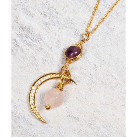 10月の誕生石ローズクォーツを使ったオリジナルネックレス。柔らかい色味のローズクォーツと落ち着いた印象のアメジストを組み合わせ、女性らしいデザインに仕上げました。月型のガラスチャームがアクセントになり、さりげなく華やかなさを演出致します。ご自身用にはもちろん、ギフトにもおすすめです。本商品はチェーン部分にゴールドフィルドを使用しております。ゴールドフィルドは、真鍮をベースに14金を圧着しており、素材の総重量の1/20以上が14金で構成されています。