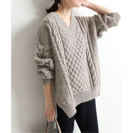 ざっくりとしたケーブル編みが特徴のVネックニット。