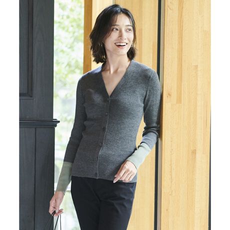 Vネックの空きが程よいので、ニット使いとしてもカーディガン使いとしてもOK。より今年らしく着こなすなら、前を留めてジャケットのインナーとして着用するのがおすすめ。ベーシックアイテムながら、さりげないお洒落感が漂う今年イチオシのアイテムです。