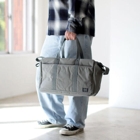 気分によって、ショルダータイプにも手持ちタイプにも出来る2WAY仕様の大容量バッグです。ショルダーストラップは取り外し可能なのもポイント。素材には軽さのあるボンディング生地をベースに、パイピング部分にはリフレクター素材を採用しています。底面には鋲を打っているため、丈夫さも兼ね備えているのも魅力。シンプルで使い勝手の良いルックスなので、幅広いスタイリングとも相性が良いです。